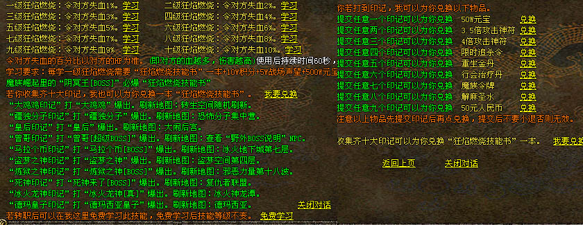 新增“狂焰燃烧”技能,打BOSS得印记,用印记换取技能书后学习。印记还可以拿来兑换各种物品。