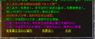 增加活动副本“冰火之歌”,每6小时开放一次,集合全服BOSS,无条件进入。