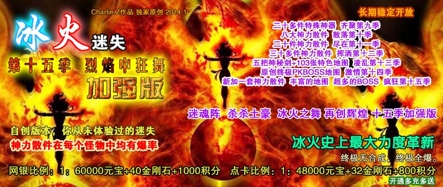 提高前期回收比例20%,增加一个福利地图“冰火狂舞”。增加迷魂阵隐藏地图中终级BOSS数量,降低中期怪物和BOSS的血量和防御,并提高杀杀土豪和迷魂阵和野外BOSS的爆率。增加“冰火之舞”中每小时刷两只“钱多多[宝箱]”和两只“灵丹大仙”。增加“冰火再舞”中每一个半小时刷5只“钱多多[宝箱]”和5只“灵丹大仙”。增加“冰火狂舞”中每两小时刷10只“钱多多[宝箱]”和10只“灵丹大仙”。增加“冰火狂舞”中爆积分的怪物。修正部分BUG(注:盗版是不会修补的)十五季加强版主要针对中期地图,和中后期地图如“迷魂阵”“杀杀土豪”“冰火之舞”等地图中的怪物和BOSS血量、防御、攻击都作了降低,而将爆率提升了一些,让玩家重回14季经典地图的感觉。野外BOSS,恐怖份子集中营,杀杀土豪,迷魂阵等所有BOSS,都有机率爆出15季终级装备。