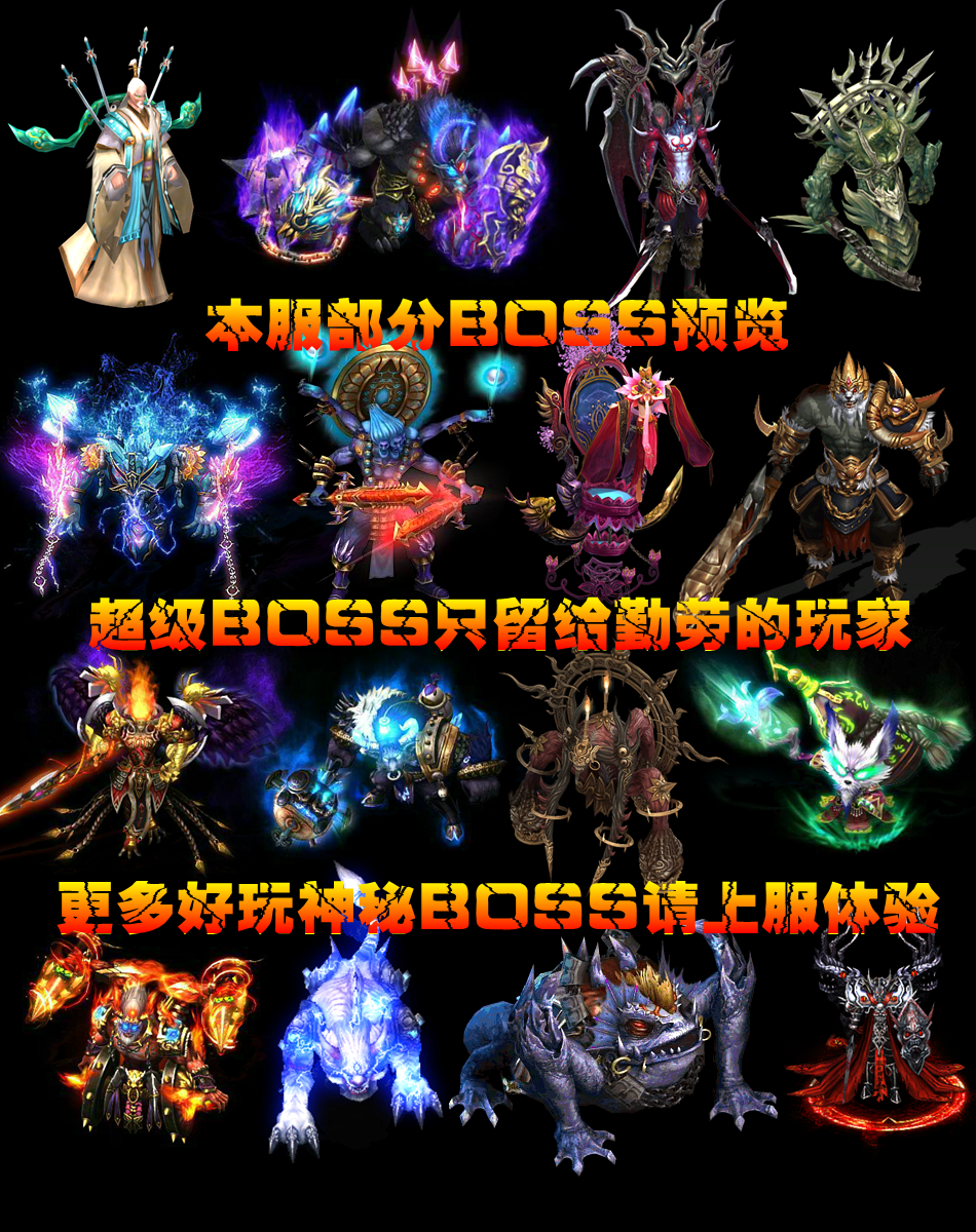 游戏介绍② >> 本服击杀BOSS全服通告,可获得终极装备,金刚石,特殊材料(大小BOSS都有获得,当然越高级BOSS获得奖励越丰富)