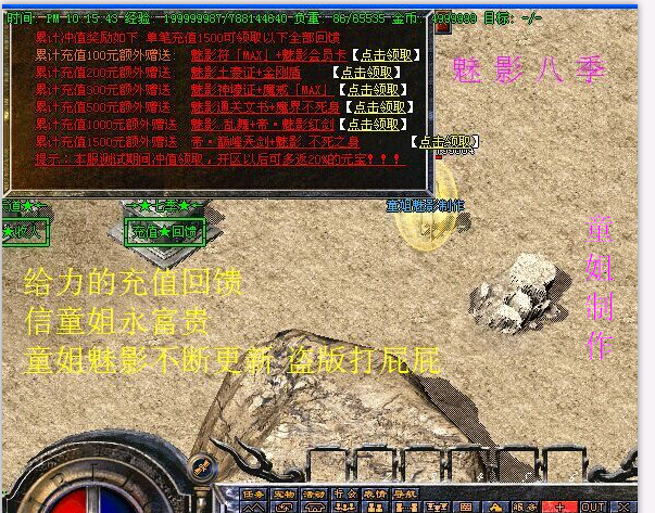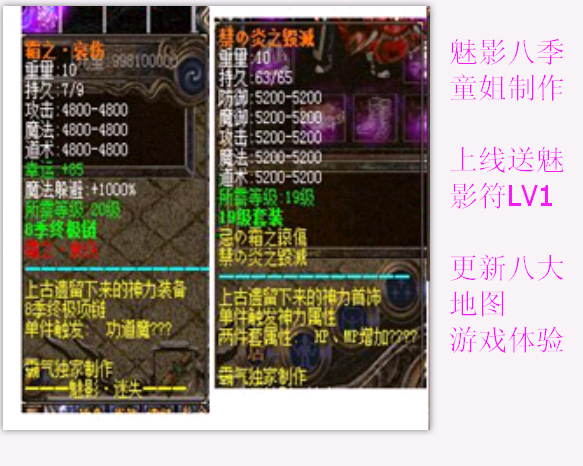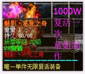2:季更新了20 21 级装备两套武器三把.特意增加20级盾牌魅影不死之神盾牌无线复活1000W元宝一次